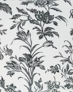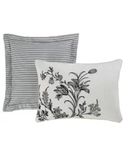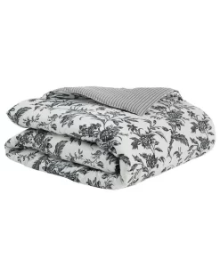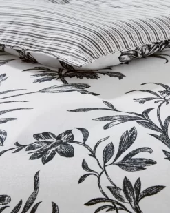 Floral toile designs have timeless appeal and Amberley is a classic in black and soft white. The 100% cotton comforter reverses to a classic black and white ticking stripe, which is repeated on the European shams and square decorative pillow. Breakfast pillow has elegant black embroidery on a white ground.