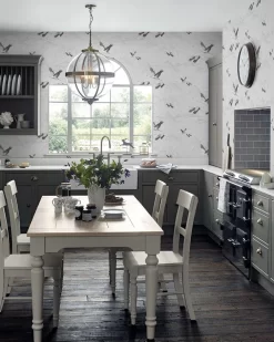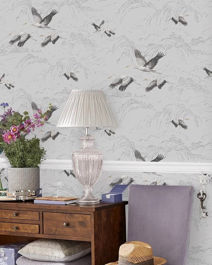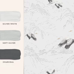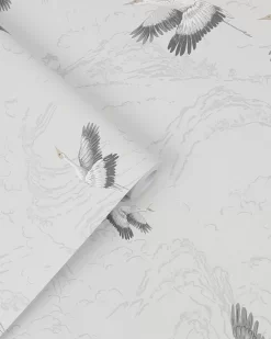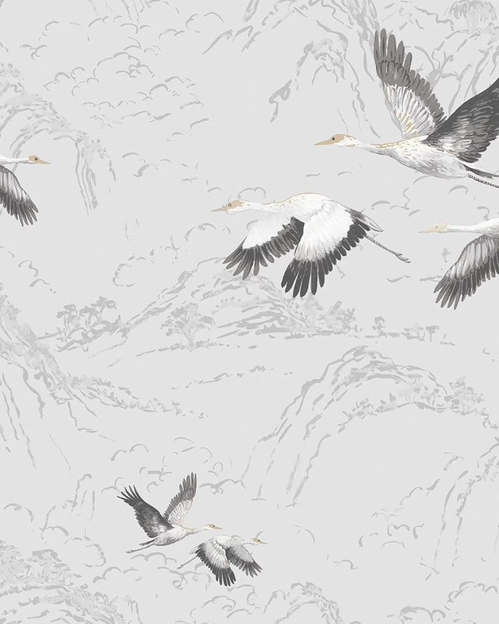 ith a contemporary yet classic feel, Animalia is perfect for adding depth to your home décor. Grey and white cranes on a light grey background are graceful while mysterious. Shimmery accents on a smooth background enhance the overall feel of the room.