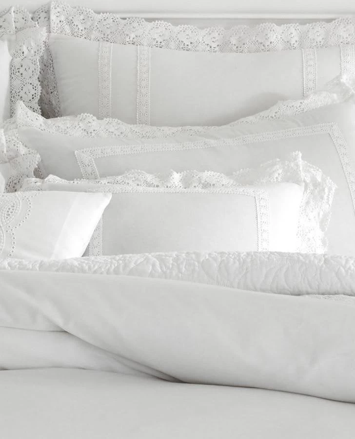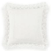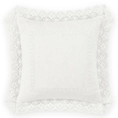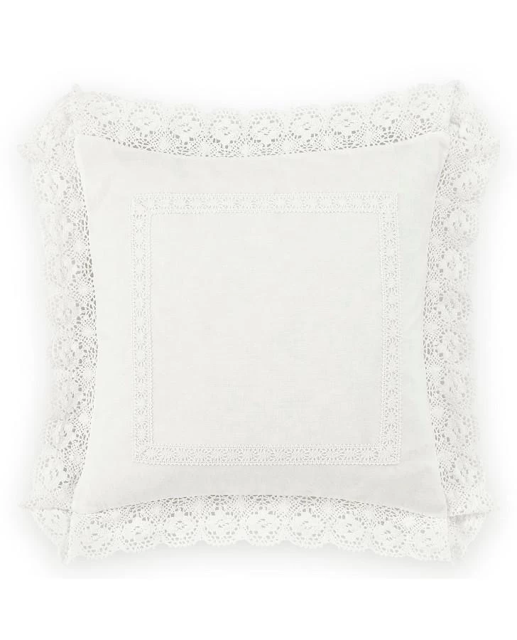 The Annabella Square Pillow is crisp ivory with a crochet border and trim.
