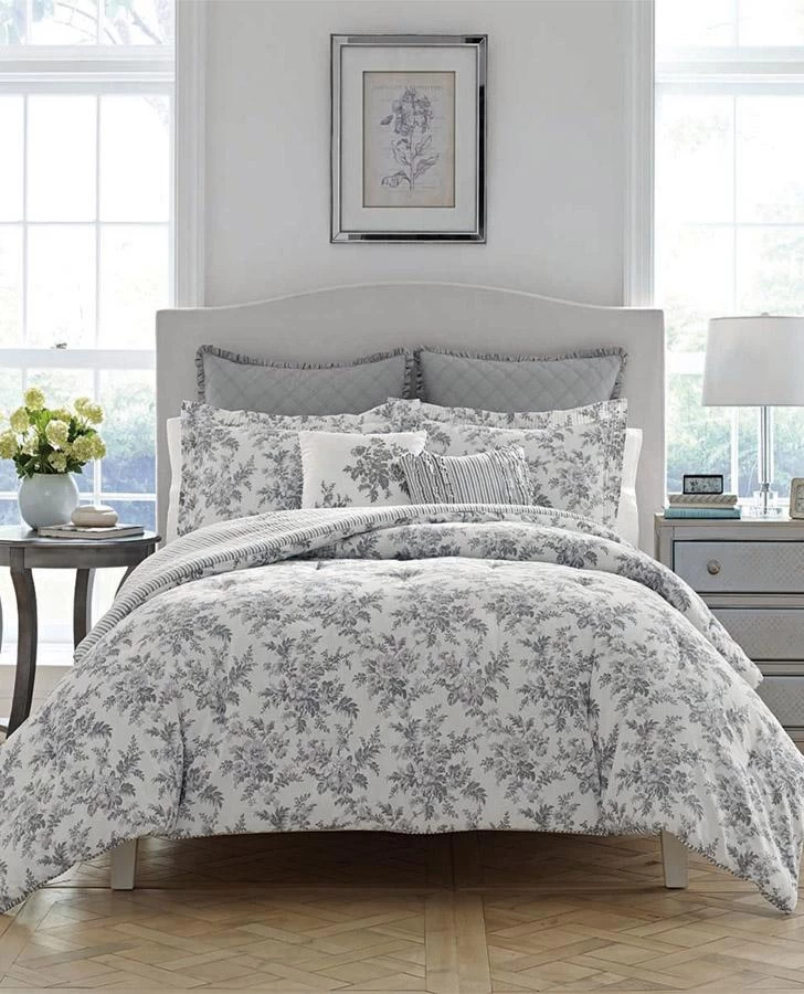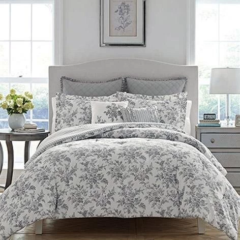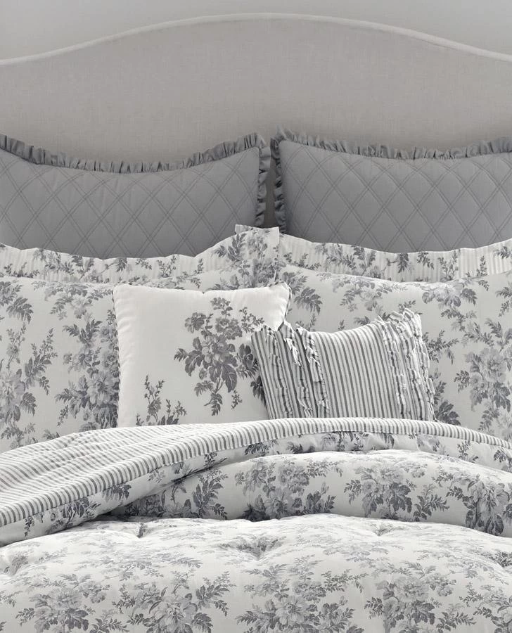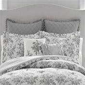 Turn on the charm with this elegant, yet casual, floral toile with shirting stripe accents. Updated in a modern neutral palette of pearl grey and white, this classic pairing will transform your bedroom into a relaxing retreat. Embroidery, quilting and ruffle detailing on the European shams and decorative pillows reflect the designer’s signature style. Set includes comforter, two standard shams, two Euro shams, two decorative throw pillows (twin contains one standard and one Euro sham).