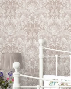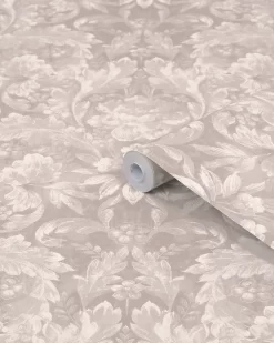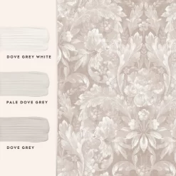 Timeless and elegant, this ornate damask print is perfect for creating a classic feel for your walls. Featuring curling acanthus plants and leaves around primula, primrose plants, roses and peony flower heads, this design is a botanical dream. In the dove grey color palette, this wallpaper is calming enough to use on all four walls.Â
