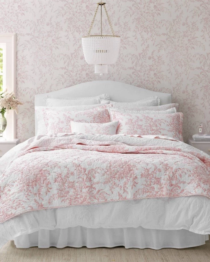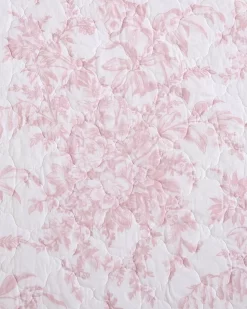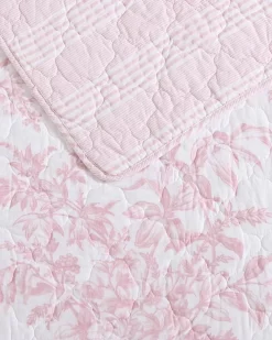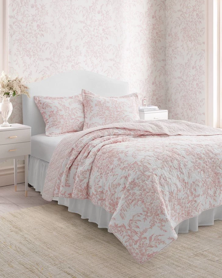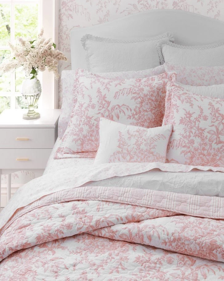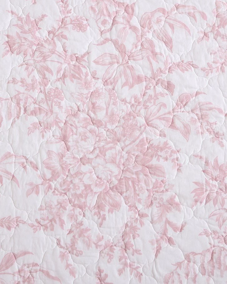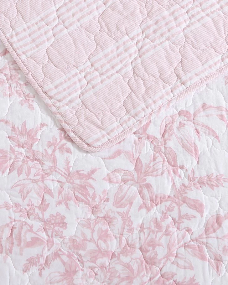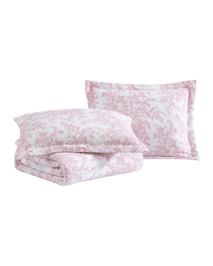 The Bedford quilt design is a timeless toile pattern updated in a fresh pink palette. This classic gets an elegant makeover with a pink and white variegated stripe that also binds the edges. 100% cotton pre-washed for softness, it becomes cozier with every wash. Filled with a blend of 80% cotton/20% poly this quilt is light weight yet can be layered for year-round use. Set includes one quilt and two shams for full/queen and king size, one sham for twin size. Machine washable for easy care.
