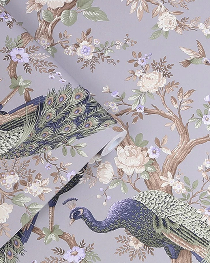Choose glamour and sophistication with this stunning Belvedere wallpaper. Classically ornate, this print features elegant peacocks and timeless florals. This pale iris colorway gives a room a sense of serenity and uniqueness.