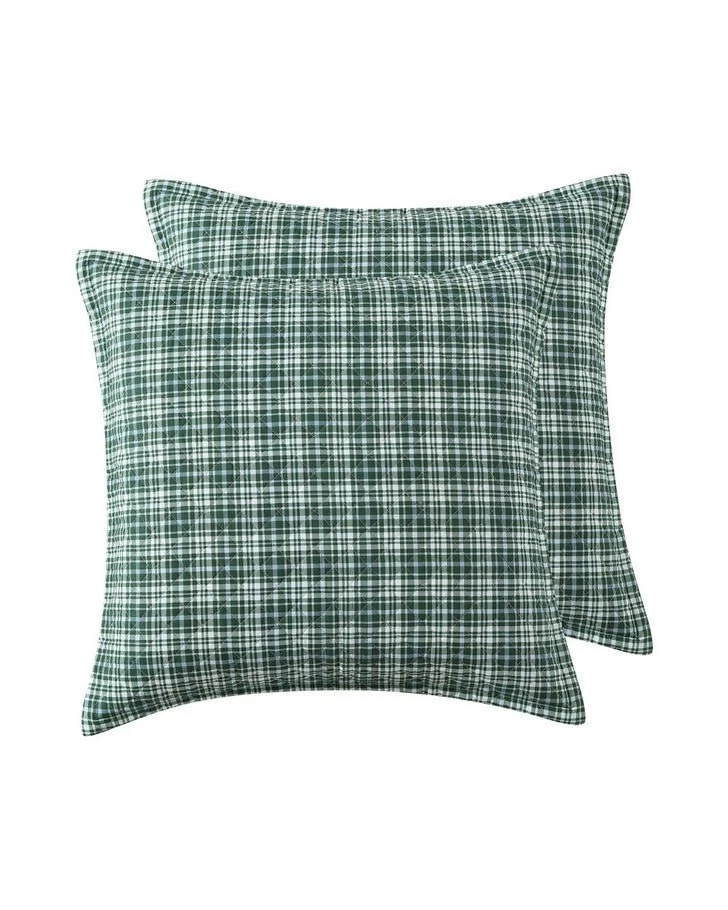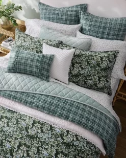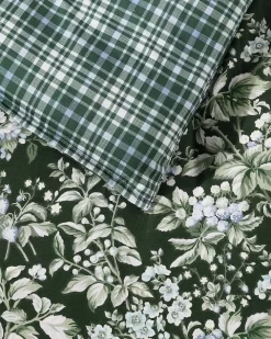 The Bramble Floral bedding set brings a fresh update to one of the best-loved signature designs from the Laura Ashley archives. Blossoms and berries in crisp white and light blue scatter across a field of deep forest green. The comforter and shams reverse to a quintessentially British plaid, which is also used for the matching European shams and ruffled pillow cover. A crisp white quilted pillow cover with floral trim adds the finishing touch.