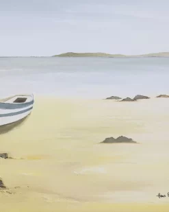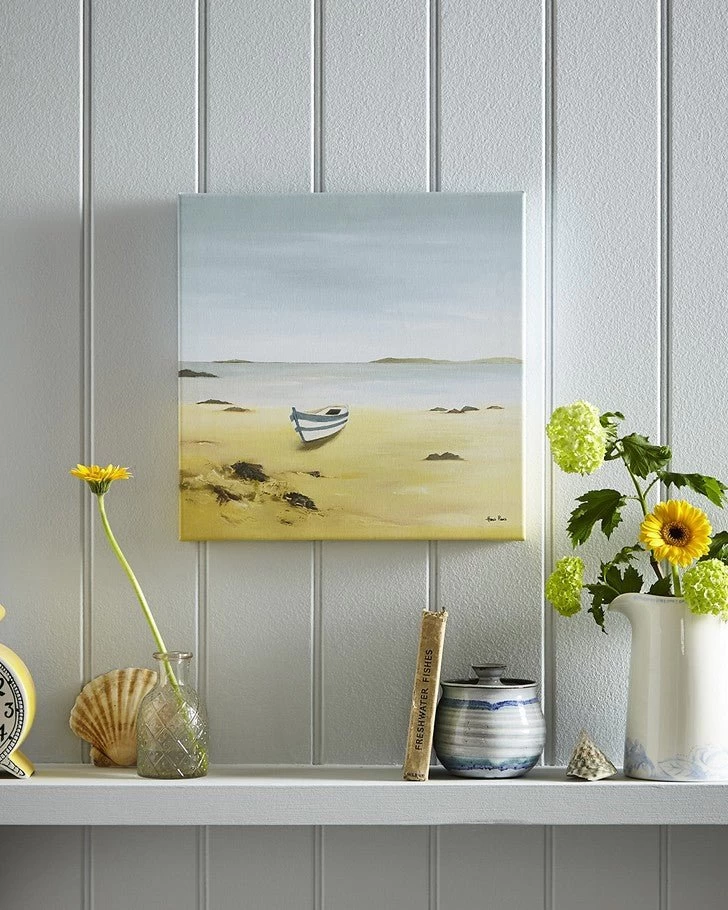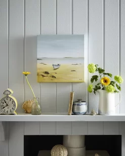 Cromer is a charming nautical inspired printed canvas design. Featuring a simple sailboat washed ashore on a lovely beach, this artwork provides simple coastal charm. This print is ideal for rooms of all sorts to bring a beachy vibe anywhere in the world.