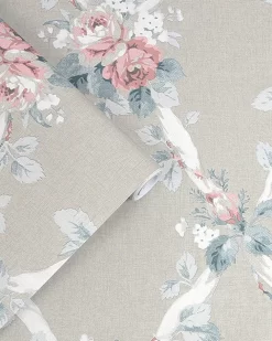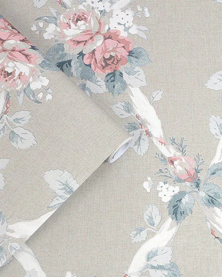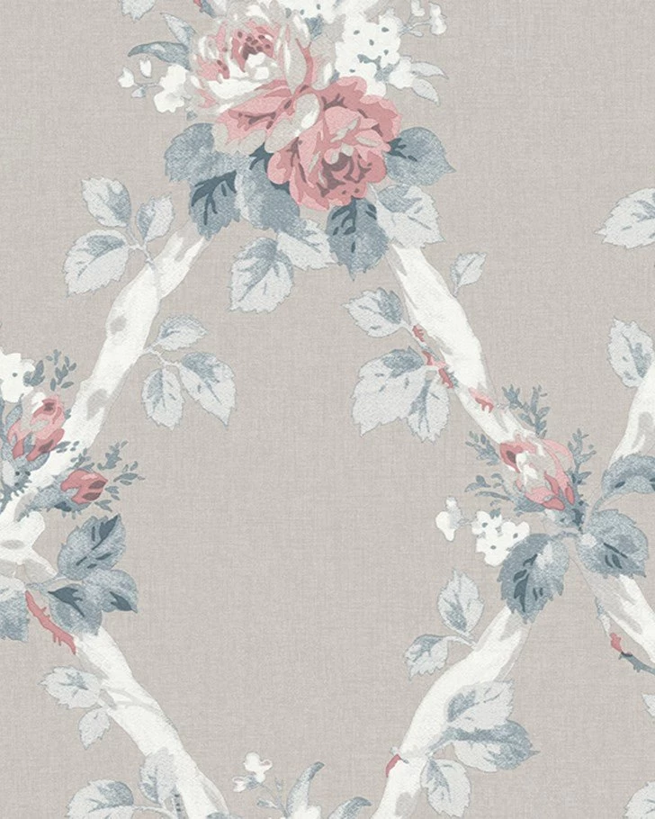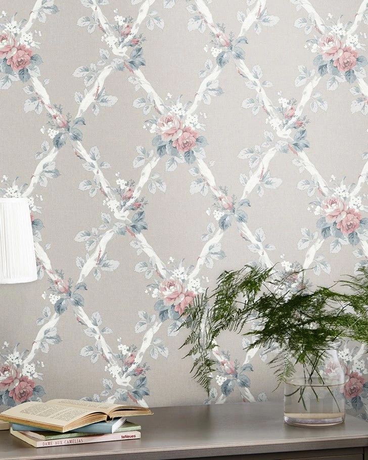Rustic and inviting, Elywn is a beautiful leaf trellis design that takes inspiration from the Laura Ashley archives. Delicate pink and blue flowers accompany a white geometric pattern atop a dove grey background. With intertwined leaf stems, this wallpaper has a charming country feel. Â