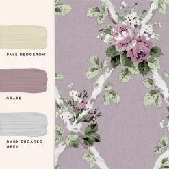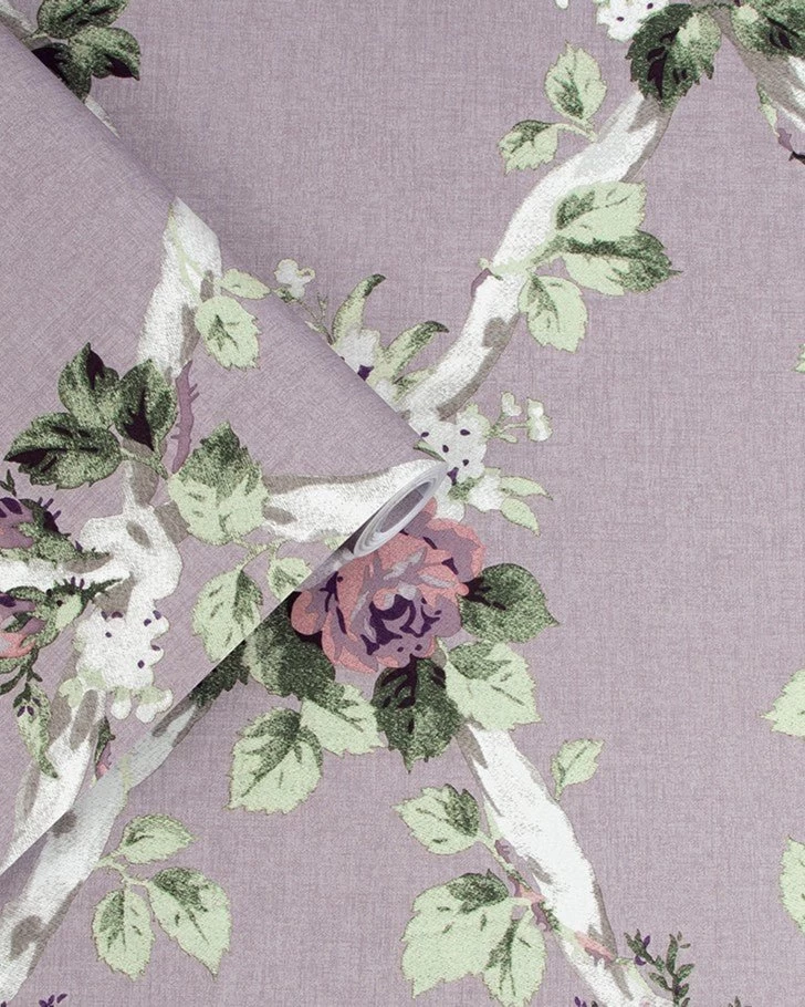 Rustic and inviting, Elywn is a beautiful leaf trellis design that takes inspiration from the Laura Ashley archives. Eye-catching purple flowers accompany a white geometric pattern atop a pale purple background. With intertwined leaf stems, this wallpaper has a charming country feel.