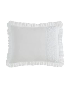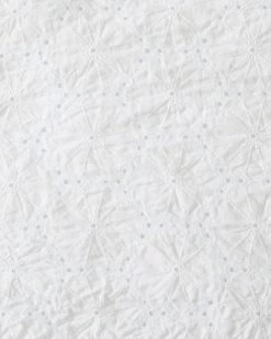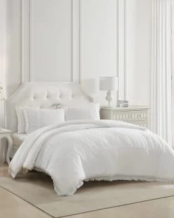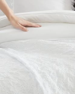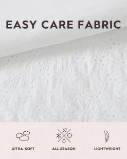 Ornate embroidery accents the elegant eyelet ruffle comforter set in solid white. Smooth solid bands border the center eyelet panel. Comforter and shams are trimmed with a ruffle edge. Soft polyester microfiber is light weight and machine washable for easy care. Pair with pure white sheets and accessories or add a pop of color or print. OEKO-TEX Standard 100 Certified: This product has been tested to be safe and free from harmful chemicals. Twin and twin xl sets include comforter and 1 standard sham; full/queen includes comforter and 2 standard shams; king set includes comforter and 2 king shams.