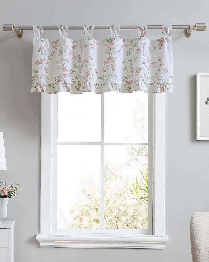 Soft pink blush and spring green pair together beautifully in the airy Fawna Window Valance from Laura Ashley. Made of 100% cotton, the valance is soft and light weight. The valance has 6 top tabs, each 4″L x 3″W, and a ruffled hem.