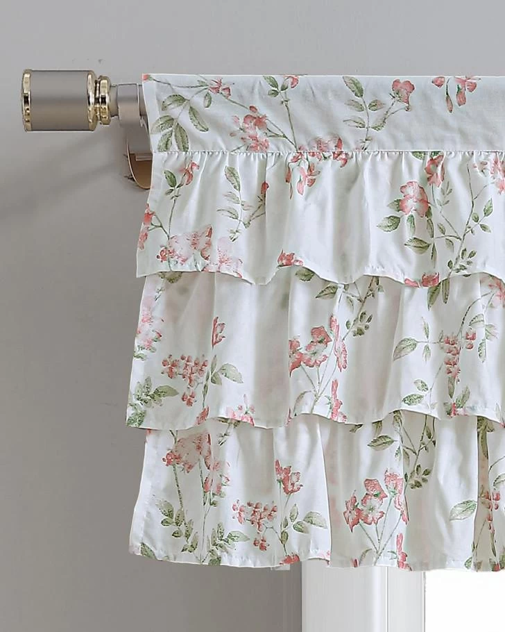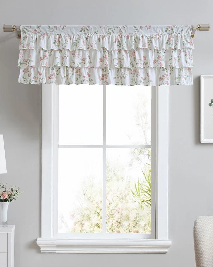 Soft pink blush and spring green pair together beautifully in the airy Fawna Window Valance from Laura Ashley. Made of 100% cotton, the valance is soft and light weight. The valance has 3 tiers of ruffles and a 3″ rod pocket.