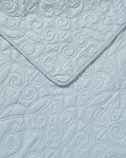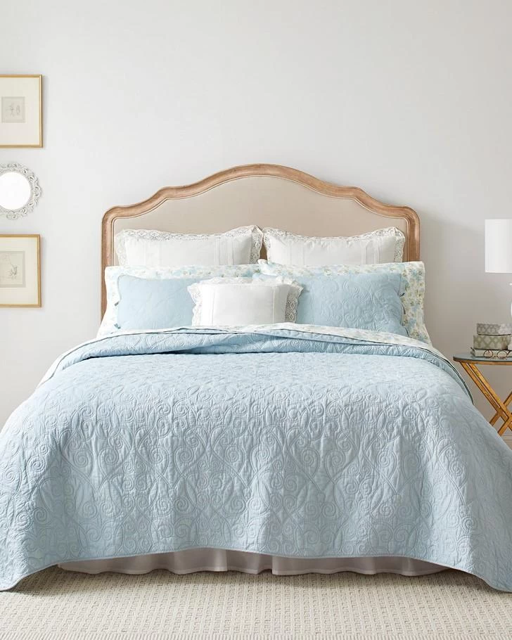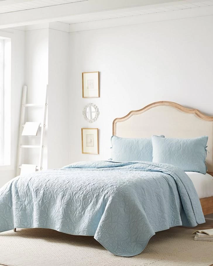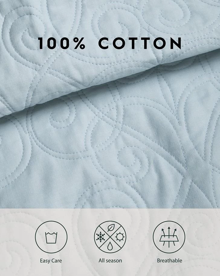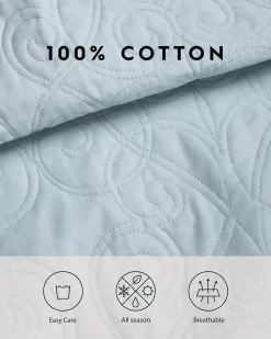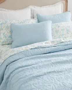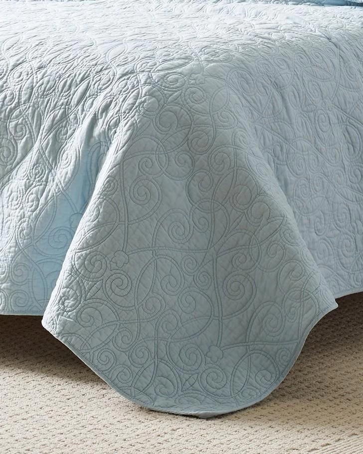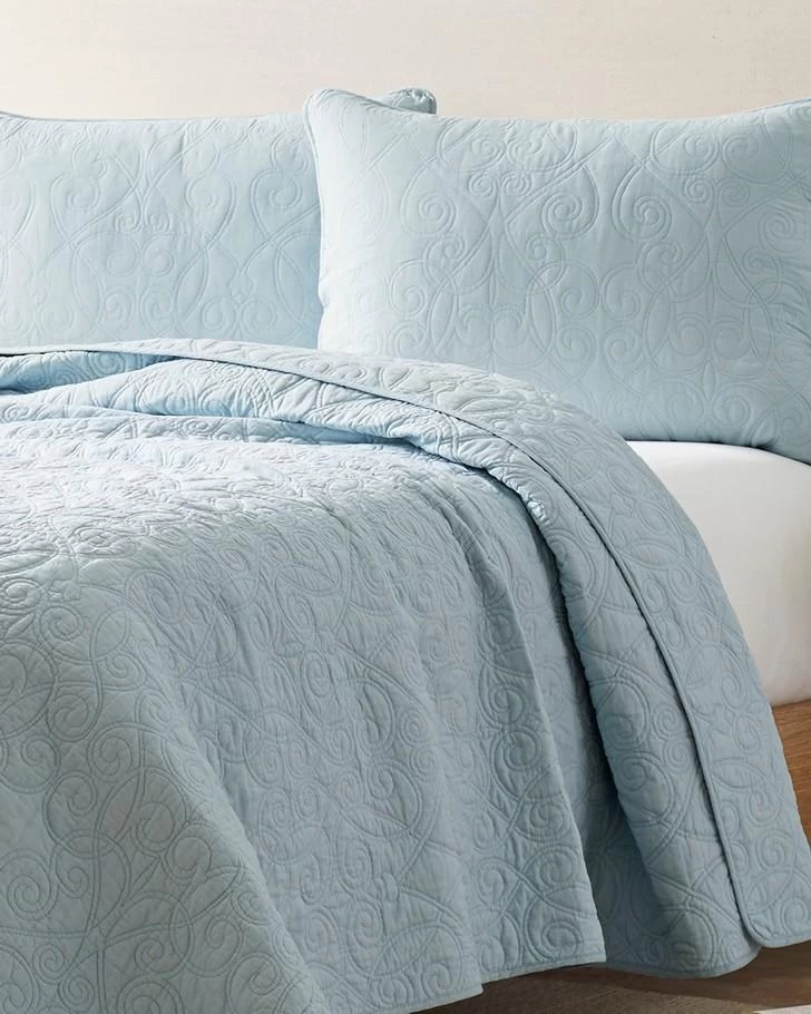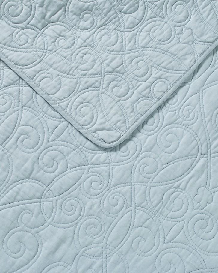 This Felicity blue quilt set is a great item to add to your current bedding or use on its own. The solid colour makes it easy to fit in your current decor or to use to layer onto your current bedding. 100% cotton materials are used, including the fill, for a soft to the touch feel. This quilt uses an ironwork quilt stitch design. Shams feature two ties for pillow inserts that are 6″ apart and 10″ long. Enjoy the comfort of this quilt set and sleep the night away.