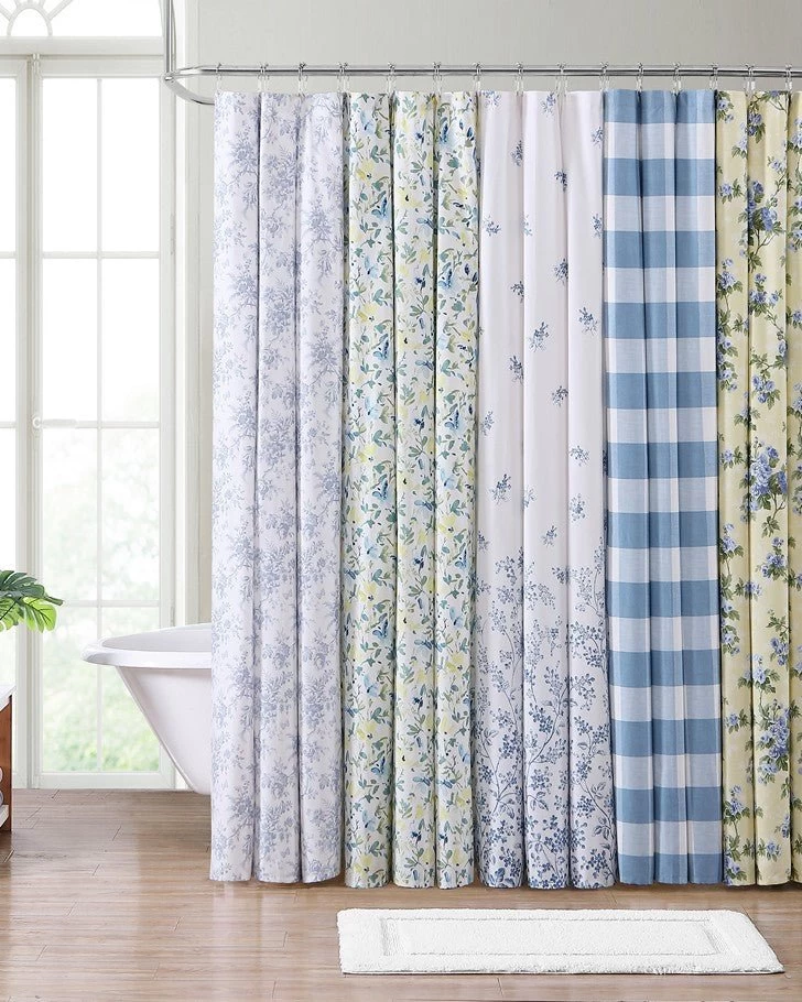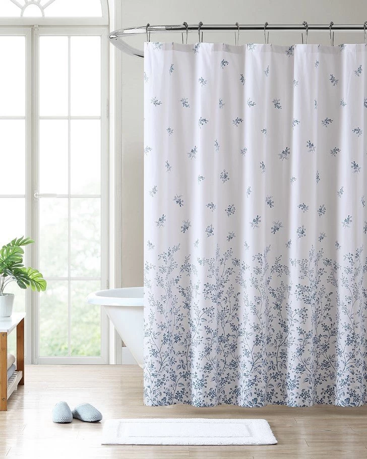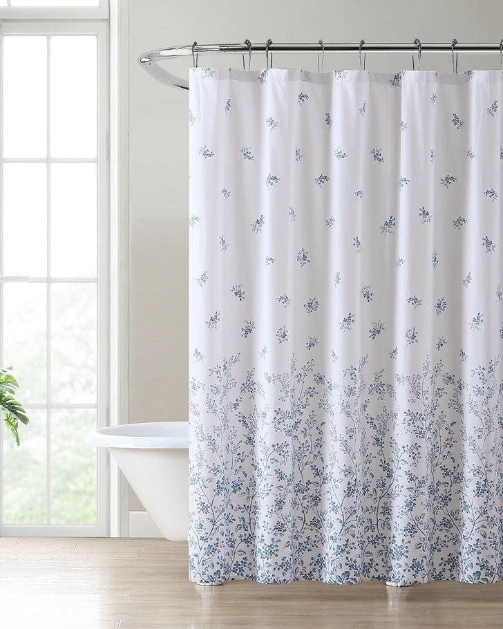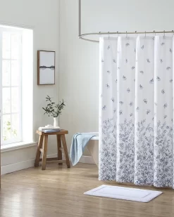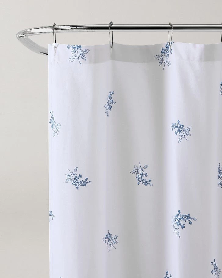 Delicate blue flowers scatter across the Flora Shower Curtain and concentrate at the hemline. This Laura Ashley floral is fresh and pretty on soft 100% cotton twill. Made in OEKO-TEX Standard 100 factory, an independent certification system that ensures textiles meet high safety and environmental standards. Durable and soft, the shower curtain has 12 hook holes. Liner and hooks are sold separately. Shower curtain measures 72″L x 72″W. Machine washable for easy care.