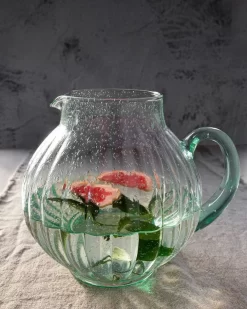 This Laura Ashley Green Glass Pitcher is shaped like a large bowl with a capacity of 100 fluid ounces. This is enough space for all your favorite drinks. Because the pitcher is mouth-blown, it has a unique shape and is a true statement piece.