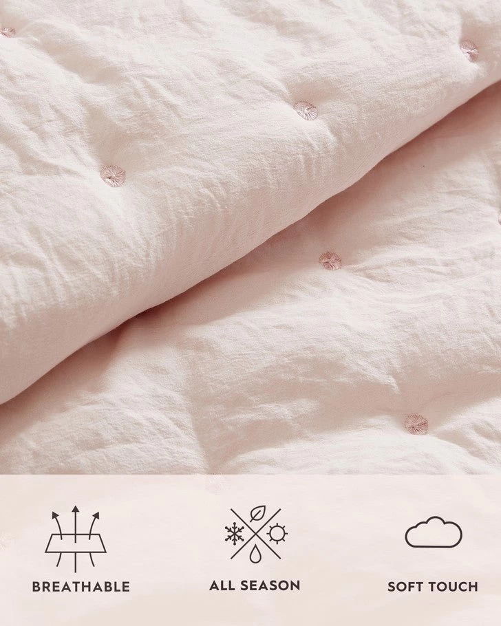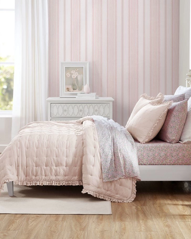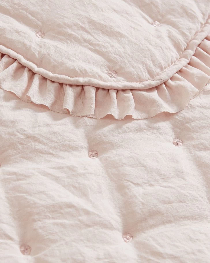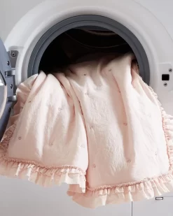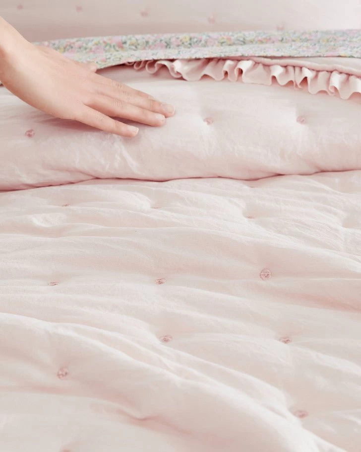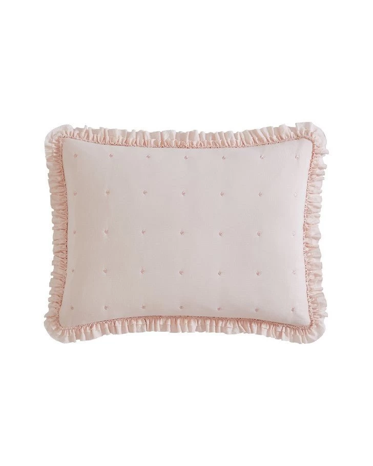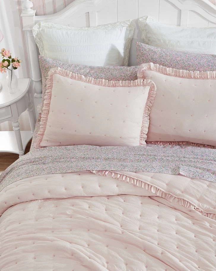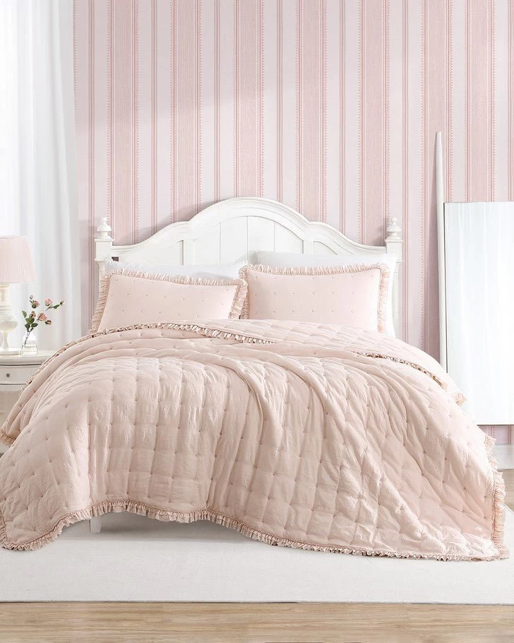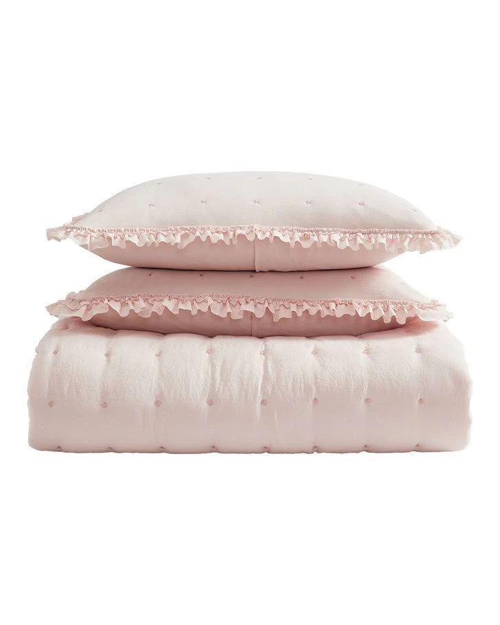 Introducing the new Laura Ashley Hailee quilt, the perfect combination of style and comfort. Made from the highest quality microfiber, this quilt is incredibly soft to the touch and will keep you cozy all night long. The quilt features an elegant, embroidered dot pick stitch and a 2″ double ruffle embellishment, adding a touch of sophistication and femininity to the design. Available in a beautiful solid pink color, this quilt is sure to become a staple in your bedroom decor. Set includes one quilt and two shams (one sham in twin size). Machine washable for easy care.