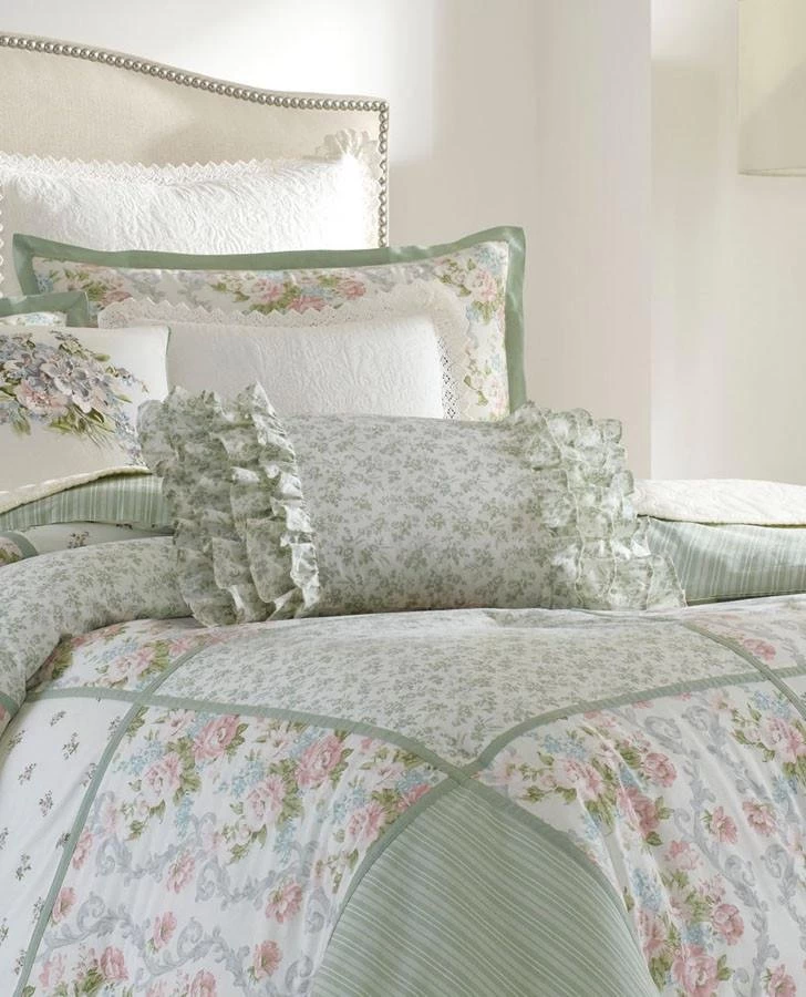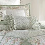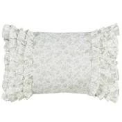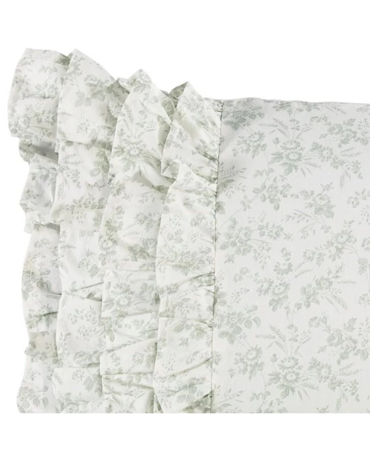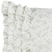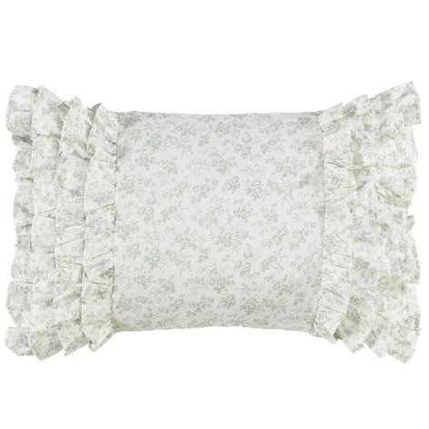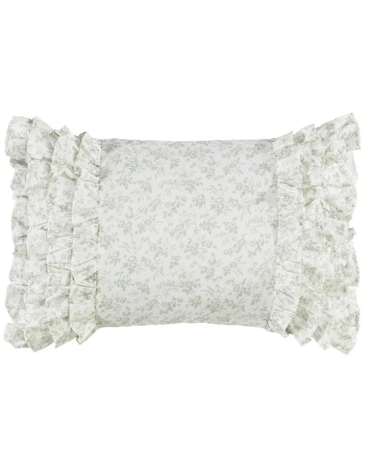 The Harper Breakfast Pillow features a pretty sage green floral print on a white background with ruffles on each end to create a stunning look.