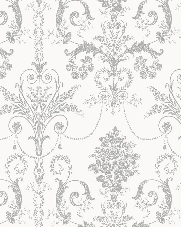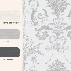 A Laura Ashley classic, Josette is an ornate and elegant damask. Featuring glamorous chandeliers and romantic rose bouquets, this wallpaper is undeniably elegant. Our French-inspired damask design adds a contemporary edge in sparkly silver metallic tones.