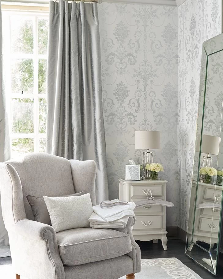 A Laura Ashley classic, Josette is an ornate and elegant damask. Featuring glamorous chandeliers and romantic rose bouquets, this wallpaper is undeniably elegant. Our French-inspired damask design adds a contemporary edge in sparkly silver metallic tones.