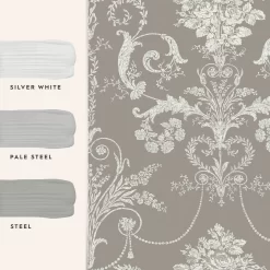 A Laura Ashley classic, Josette is an ornate and elegant damask. Featuring glamorous chandeliers and romantic rose bouquets, this wallpaper is undeniably elegant. Our French-inspired damask design adds a contemporary edge in steel grey and white tones.