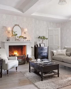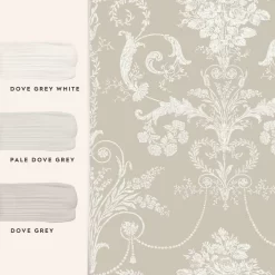A Laura Ashley classic, Josette is an ornate and elegant damask. Featuring glamorous chandeliers and romantic rose bouquets, this wallpaper is undeniably elegant. Our French-inspired damask design adds a contemporary edge in dove grey and white tones.