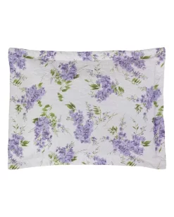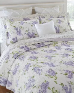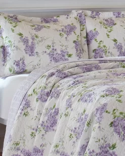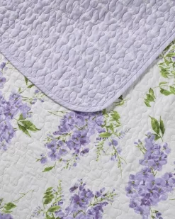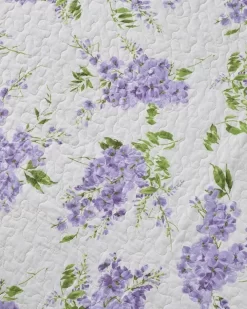 Keighley is a new addition to our lovely quilt line. Wisteria blossoms cascade across a pristine white background in this delightful quilt set that will bring a touch of springtime to your bedroom. Quilt reverses to a pale lilac mixed with accented by the white vine stripe print. Set includes one quilt and two shams (twin set includes one sham).