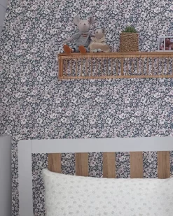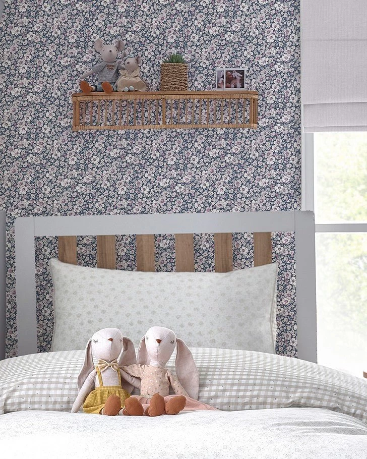 Create a fresh children’s room interior with the Libby wallpaper. An allover ditsy floral pattern featuring an abundance of stylised flowers including anemones, bell and daisy flowers at a small scale. This pretty archive print can be dated back to the late 90s.