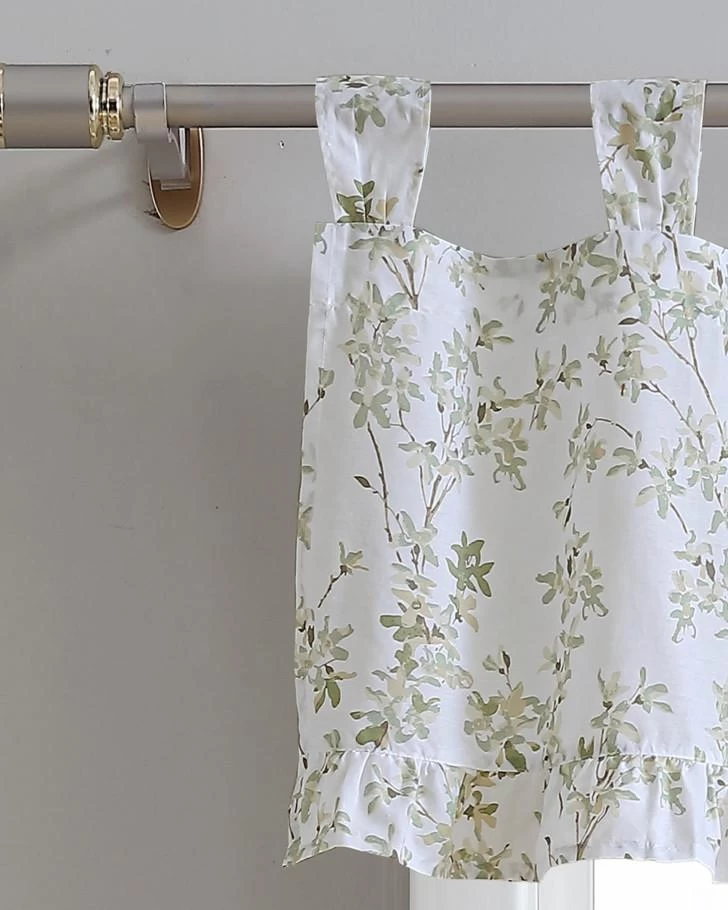 Laura Ashley’s Lindy delicate leafy branches in hues of spa green, beige and white transforms your bedroom or bath into a relaxing retreat. Made of 100% cotton, the valance is soft and light weight. The valance has 6 top tabs, each 4″L x 3″W, and a ruffled hem.