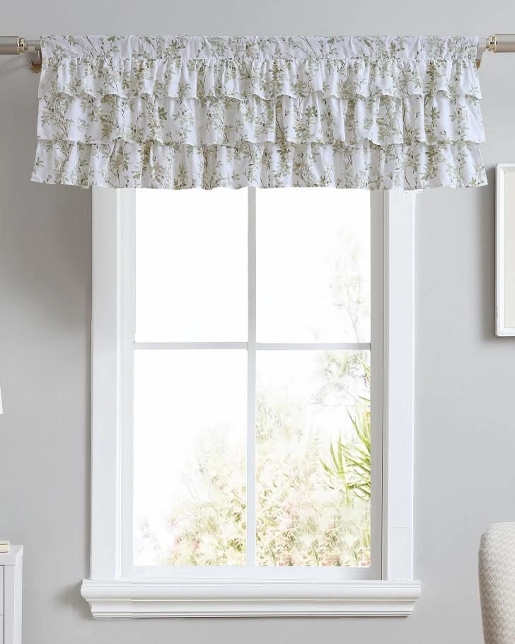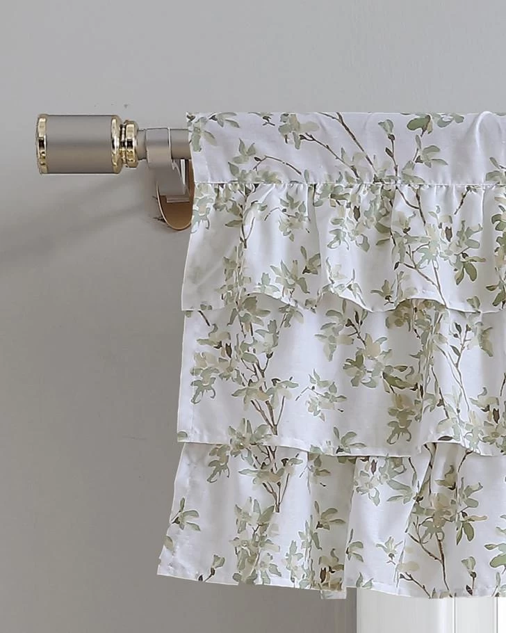 Laura Ashley’s Lindy delicate leafy branches in hues of spa green, beige and white transforms your bedroom or bath into a relaxing retreat. Made of 100% cotton, the valance is soft and light weight. The valance has 3 tiers of ruffles and a 3″ rod pocket.