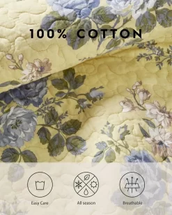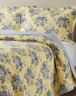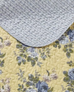 Laura Ashley’s Linley quilt set infuses your room with cheerfulness and light. Blue floral bunches stand out nicely against the muted yellow background. Paired with a blue horizontal stripe on the reverse side, the quilt comes together in traditional beauty that brightens your room. Quilt set includes one quilt and two shams (twin set includes one sham)