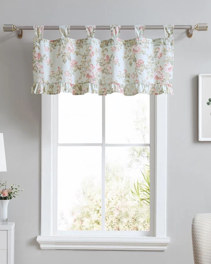 The Laura Ashley Madelynn Window Valance adds cottage charm to any room with antique pink roses on a seafoam green ground. Made of 100% cotton, the valance is soft and light weight. The valance has 6 top tabs, each 4″L x 3″W, and a ruffled hem.