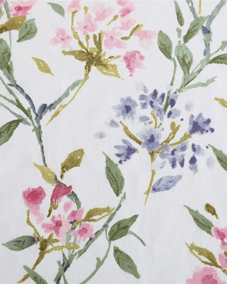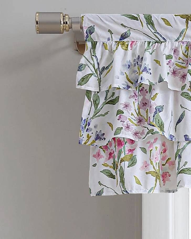 The Laura Ashley Meadow Breeze Window Valance adds a breath of fresh air with tossed spring blooms. Deep pink and purple bouquets are scattered across a crisp white ground. Made of 100% cotton, the valance is soft and light weight. The valance has 3 tiers of ruffles and a 3″ rod pocket.