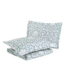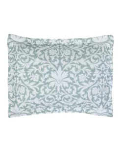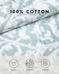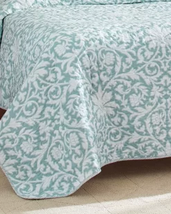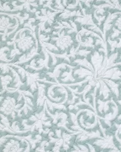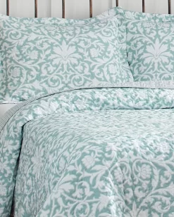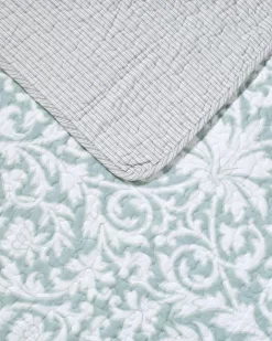 Cool and inviting, the Mia washed cotton quilt set offers relaxed elegance that is equally at home in a traditional master bedroom or a country cottage. Classic scrollwork in white on a clear turquoise ground is featured on the quilt face and shams, while a delicate wallpaper stripe reverse adds a sublte finishing touch to this inviting ensemble.