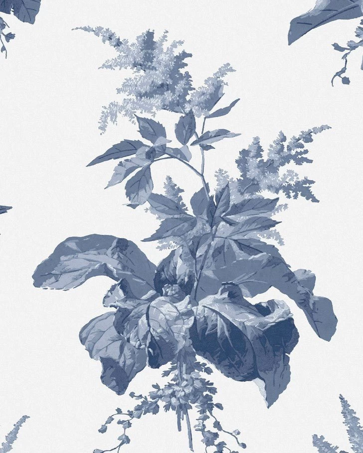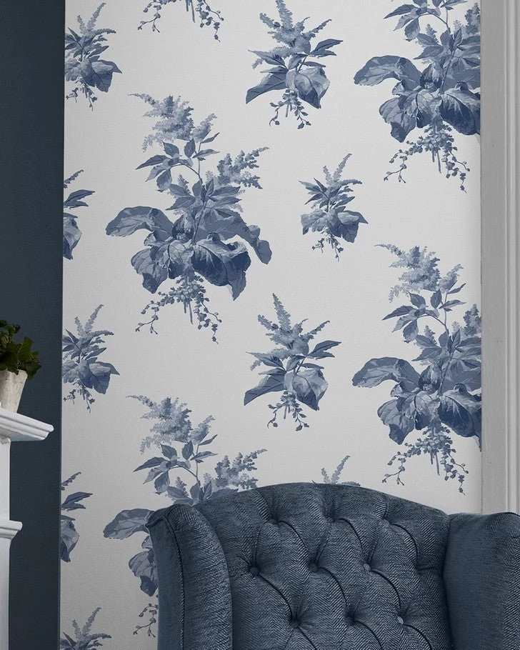 This eye-catching design was originally inspired by a sample of wallpaper added to the Laura Ashley archive in 1987. Narbeth is a large-scale naturalistic design that features bouquets of deciduous tree leaves intertwined with feathery flowers. In the midnight seaspray blue colorway, this wallpaper is perfect for creating an elegant yet statement interior.