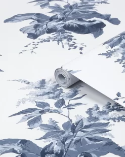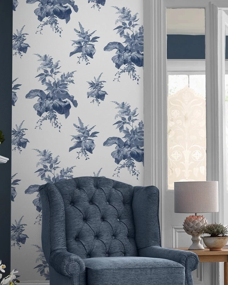 This eye-catching design was originally inspired by a sample of wallpaper added to the Laura Ashley archive in 1987. Narbeth is a large-scale naturalistic design that features bouquets of deciduous tree leaves intertwined with feathery flowers. In the midnight seaspray blue colorway, this wallpaper is perfect for creating an elegant yet statement interior.