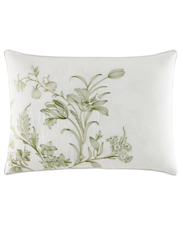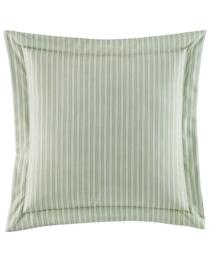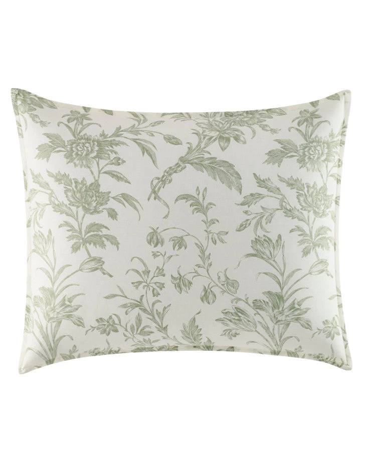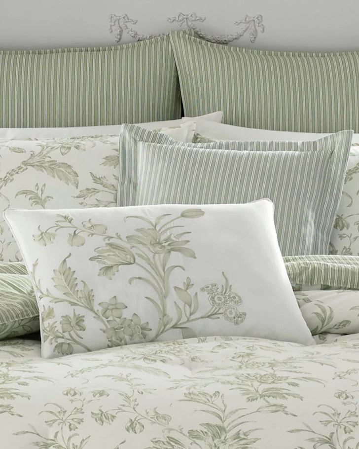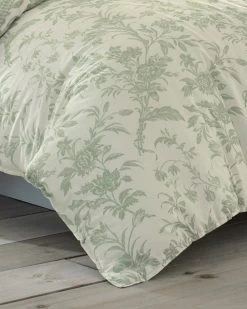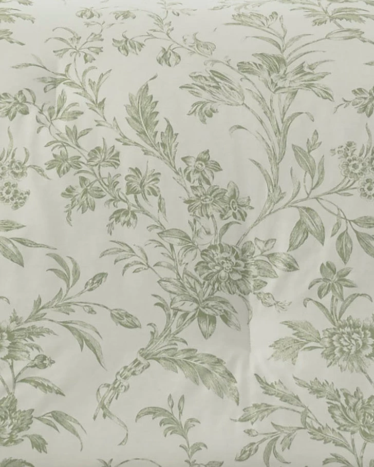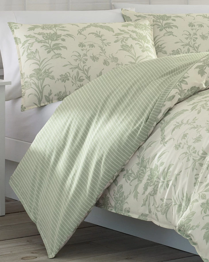 Sage green is a serene, beautiful color and it brings a lovely tranquility to this classic floral toile on ivory cotton ground. Coordinated with a crisp shirting stripe on the duvet reverse, European shams and square pillow, this timeless classic fits easily into a modern bedroom. A floral embroidered accent pillow repeats the duvet design and lends a unique, customized detail to the ensemble. Duvet cover features button closures with additional corner ties. Duvet insert is not included. Set is machine washable for easy care.