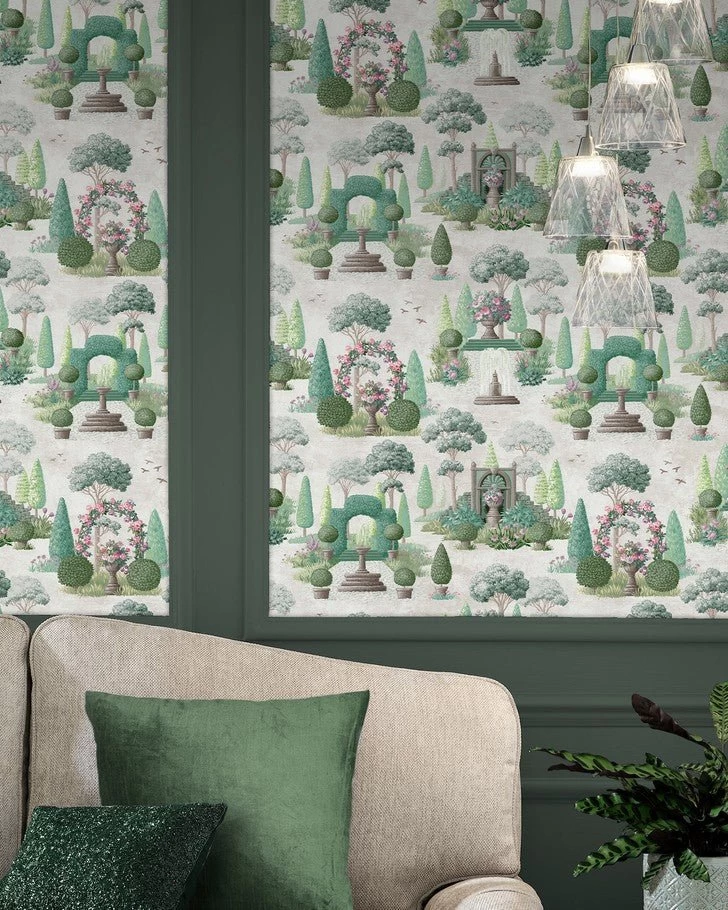 Inspired by the rich heritage of the Laura Ashley archive, Naunton Folly is a bespoke painted piece, combining various prints to create this statement garden scene. This pattern features intricate painted flowers, water features, and charming rose arches. This grand piece evokes the feeling of an inviting British stately home garden.
