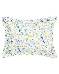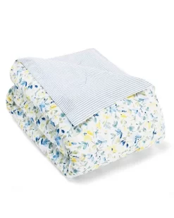 No matter the season, you can always wake up to Spring with this carefree watercolor floral bedding set. A garden fresh palette of cornflower blues and sunny yellow on a crisp white cotton ground reverses to a classic blue and white ticking stripe that also appears on the European shams and a coordinating shirred accent pillow. An additional accent pillow made of white cotton eyelet embroidery adds a signature heirloom touch to this updated cottage style. Set includes comforter, 2 shams, 2 Euro shams, Breakfast Pillow, Square Pillow (twin size includes one sham and one Euro sham).