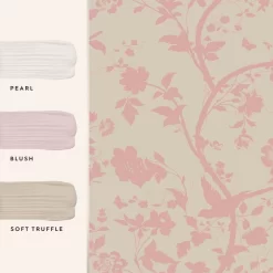 Enhanced with pearlescent inks, Oriental Garden Pearlescent is glamorous and elegant. This botanical wallpaper features beautiful, silhouetted birds and butterflies in an exotic garden. Pink details on a shimmery natural background allow this print to add a pop of color while still saying classic.