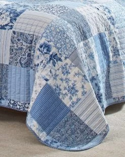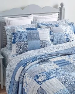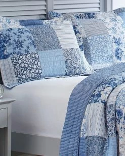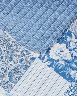 The patchwork features a combination of floral, stripes, and paisley print for an overall modern take on a traditional design. The quilt reverses to a vertical white stripe on a blue ground that also binds the quilt. Prewashed for extra softness, the cotton quilt features a polyester fill. Included shams feature an overlap closure. Set includes quilt and two shams (twin size includes one sham).