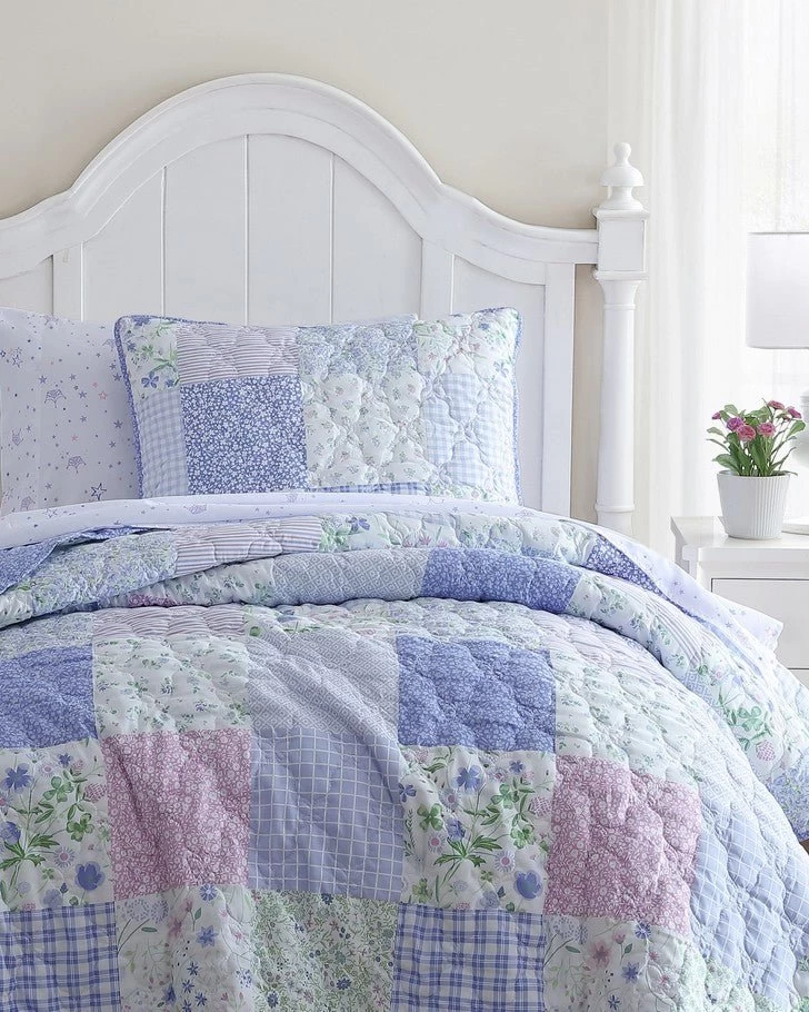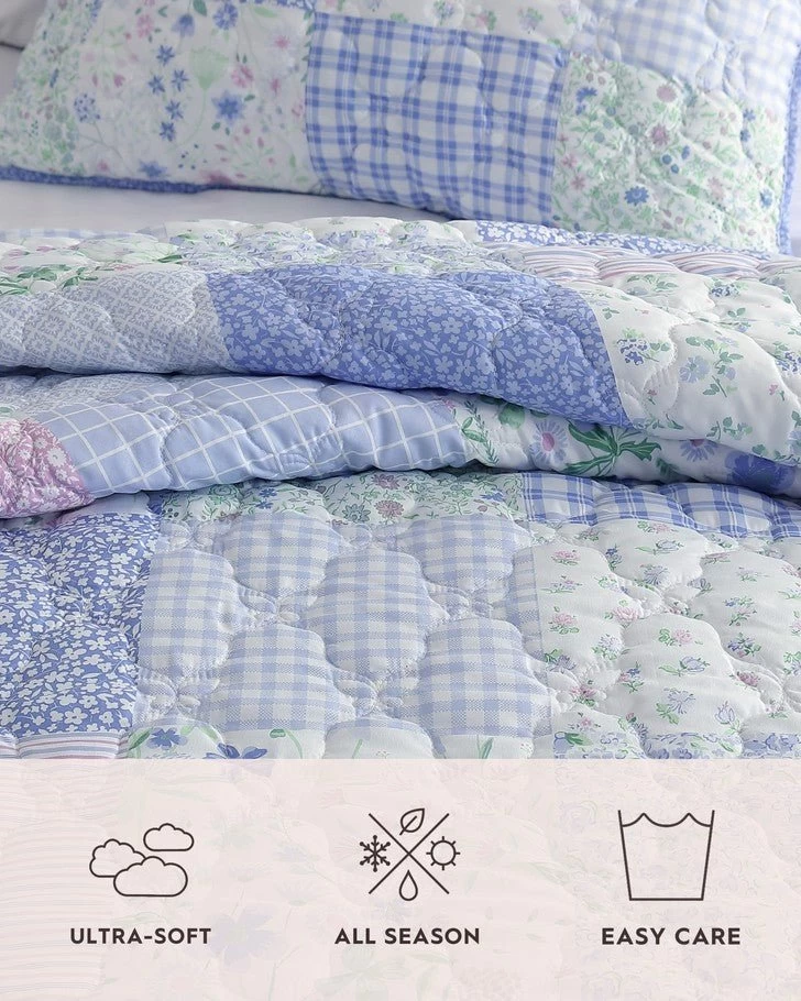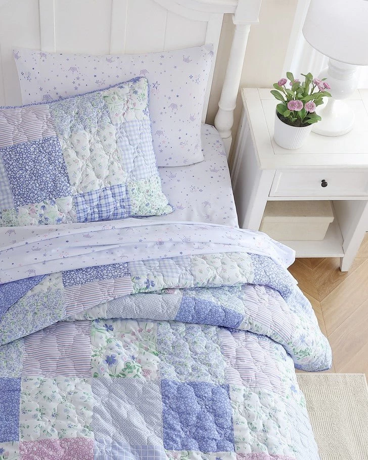 Introducing the Laura Ashley kids parker patchwork quilt set, a delightful addition to your child’s bedroom that combines playful patterns and a charming color story for a space they’ll adore. This beautiful quilt set features a patchwork design, bringing together floral, plaid, and stripe elements in a whimsical fusion of purple, white, and green hues. The materials are 100% soft microfiber. CPSIA tested, ensuring it meets the highest safety standards for kids’ products. Additionally, it is Oeko-Tex Certified, guaranteeing that it is free from harmful substances, making it safe for your child’s delicate skin.