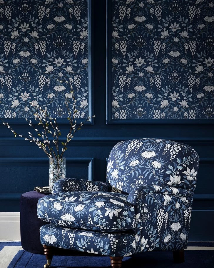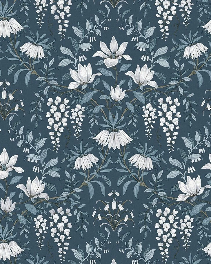Add sophisticated elegance to your home with this beautiful floral wallpaper. Painted white flowers and swirling patterns of leaves on a dark seaspray background creates a moody yet refined feel. Parterre brings a modern feel to a vintage style pattern.Â