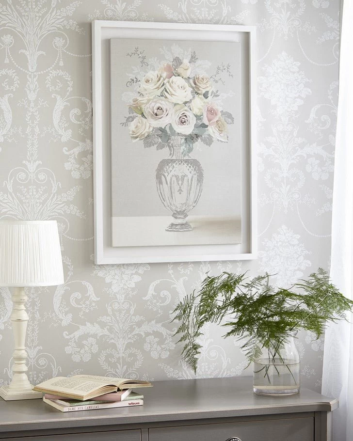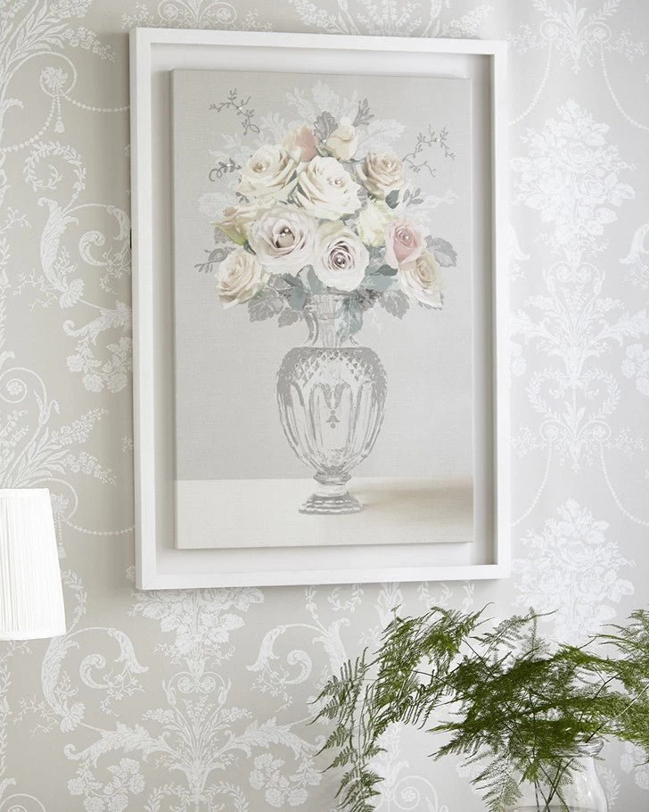 Timeless and romantic, Rose Bouquet Vase is embellished with beautiful pearls to create a clean and classic look. This design is both elegant and striking, especially against one of our Laura Ashley wallpapers. Coordinate with Laura Ashley Josette Dove Grey wallpaper for an ornate and polished effect.
