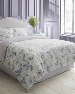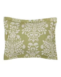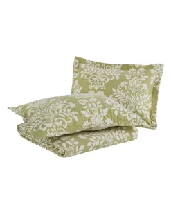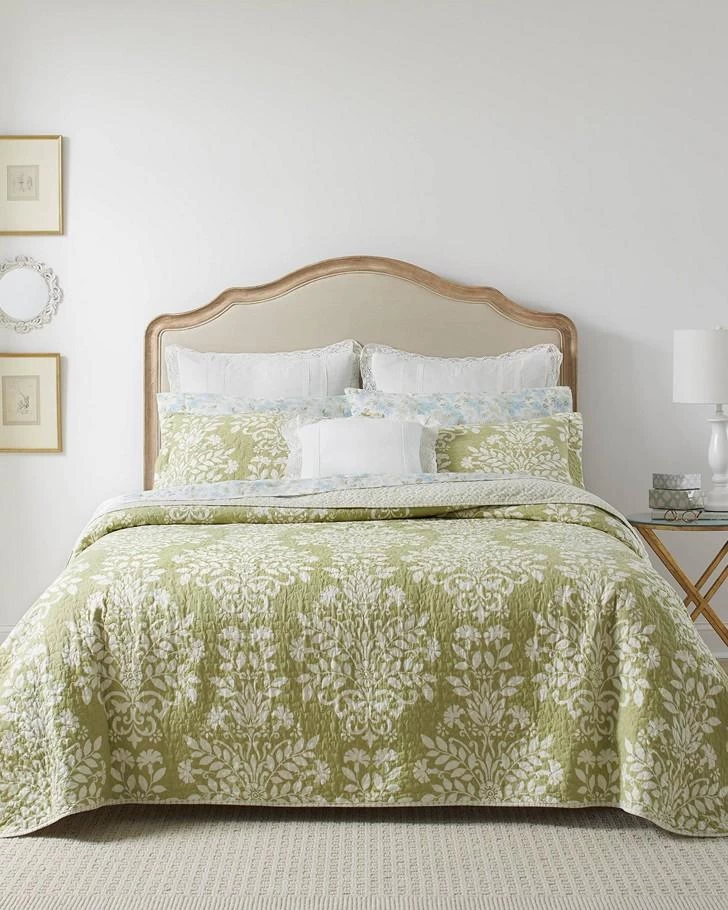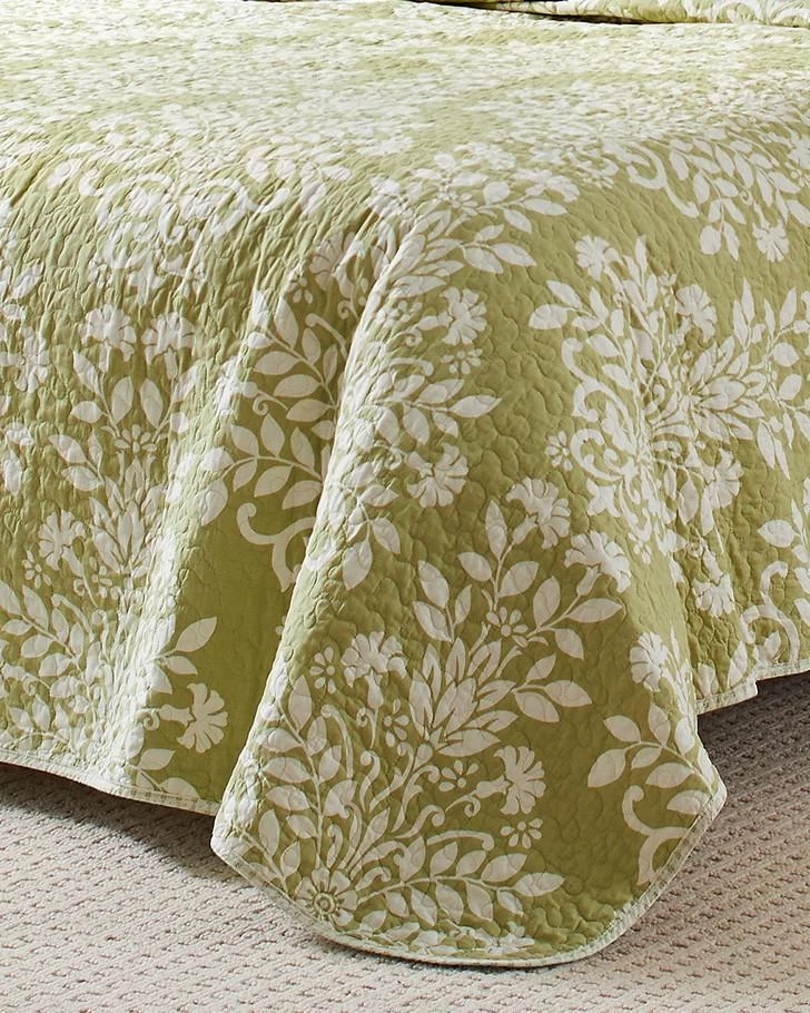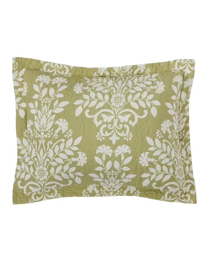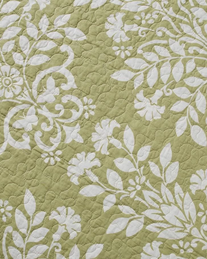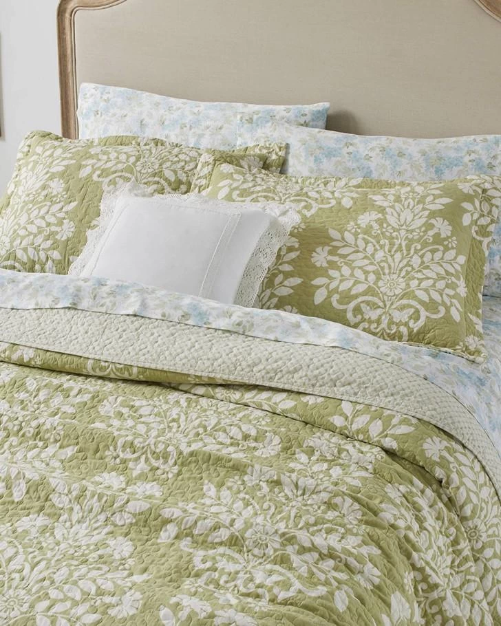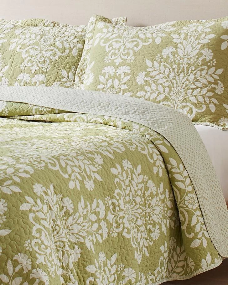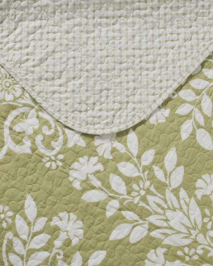 Laura Ashley’s Rowland Quilt combines the splendor of damask with the timeless quality of quilting to create high style. The white floral damask runs in close vertical rows up a sage/white background, paired with a geometric design on the reverse side. Quilt set includes one quilt and two shams (twin set includes one sham)