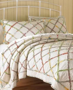 Ruffled Garden is the newest addition to the Laura Ashley quilt assortment. Classic Laura Ashley prints are featured in an updated technique on the Ruffle Garden Sham. Bands of appliqued ruffles form a trellis pattern and are layered on top of an ivory ground with diamond quilting details. The accessories highlight the prints used on the quilt by using innovative techniques and textures.