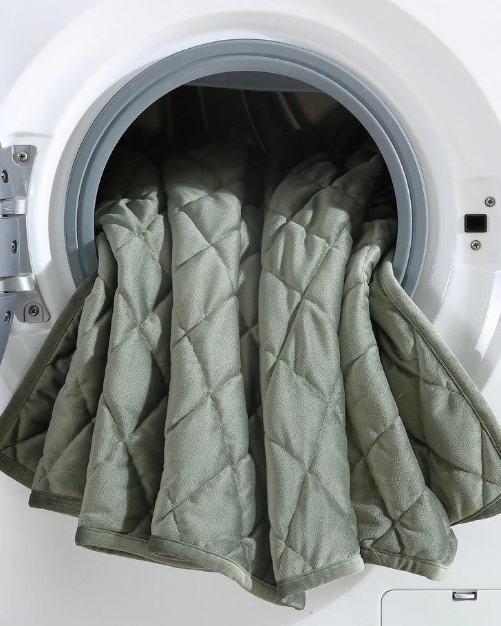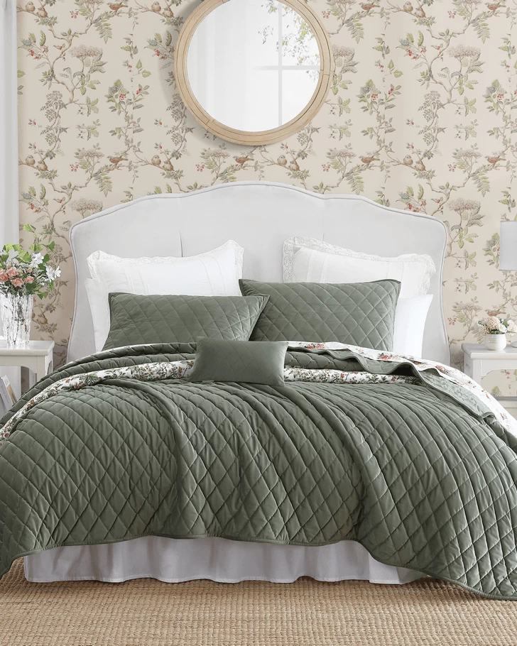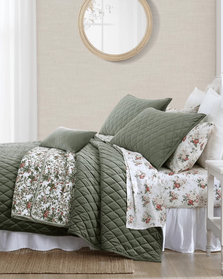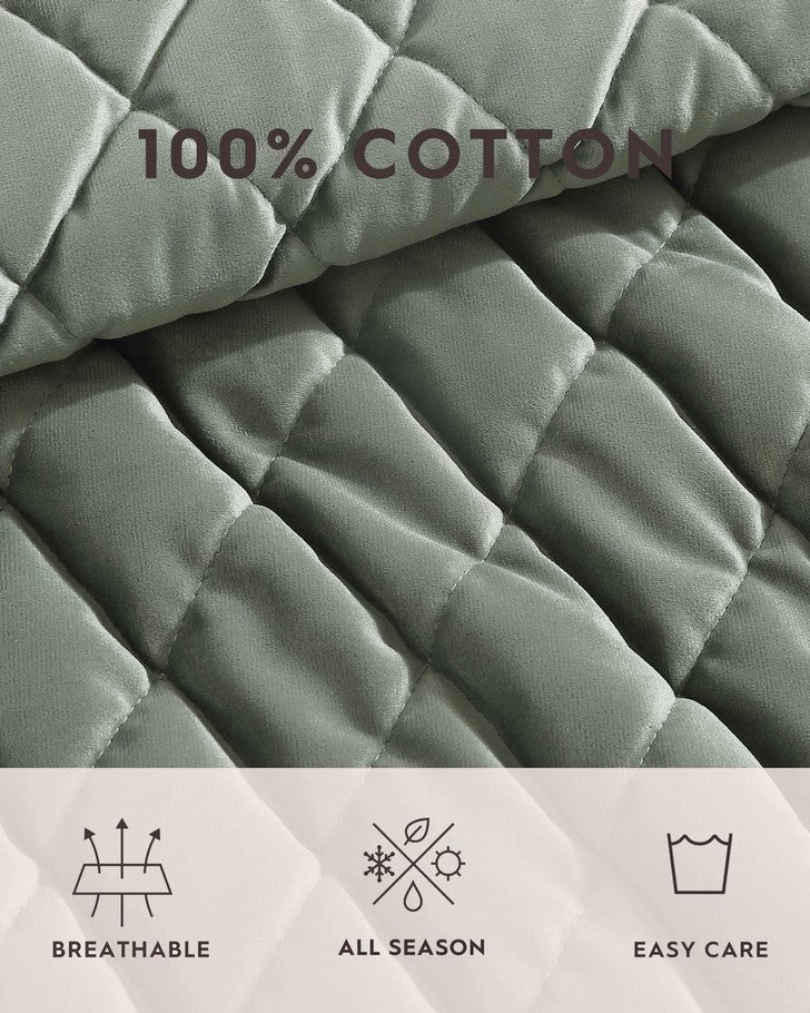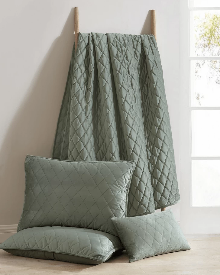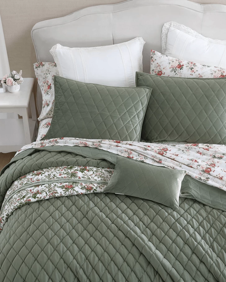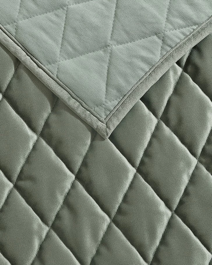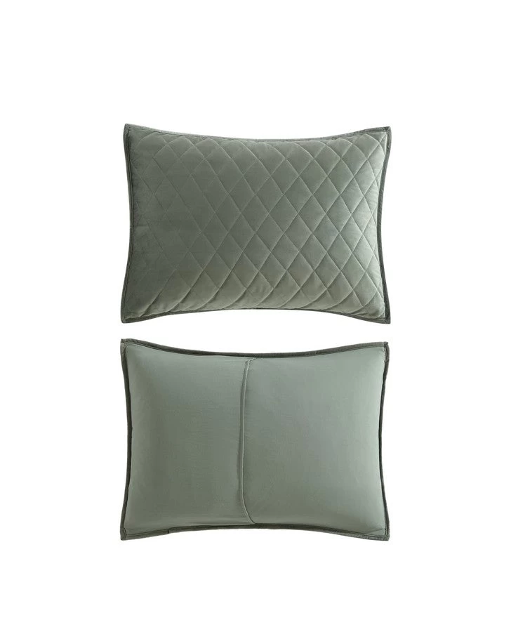 Sumptuous plush velvet with a classic diamond stitch makes an elegant statement in this Laura Ashley quilt set. The dark green color is timeless and velvet adds a romantic touch. As a layer or stand-alone, this set is a versatile addition that can be used year round. Included shams feature a 2 piece back envelope closure. Decorative pillow cover has a zipper closure. Set is machine washable for easy care.