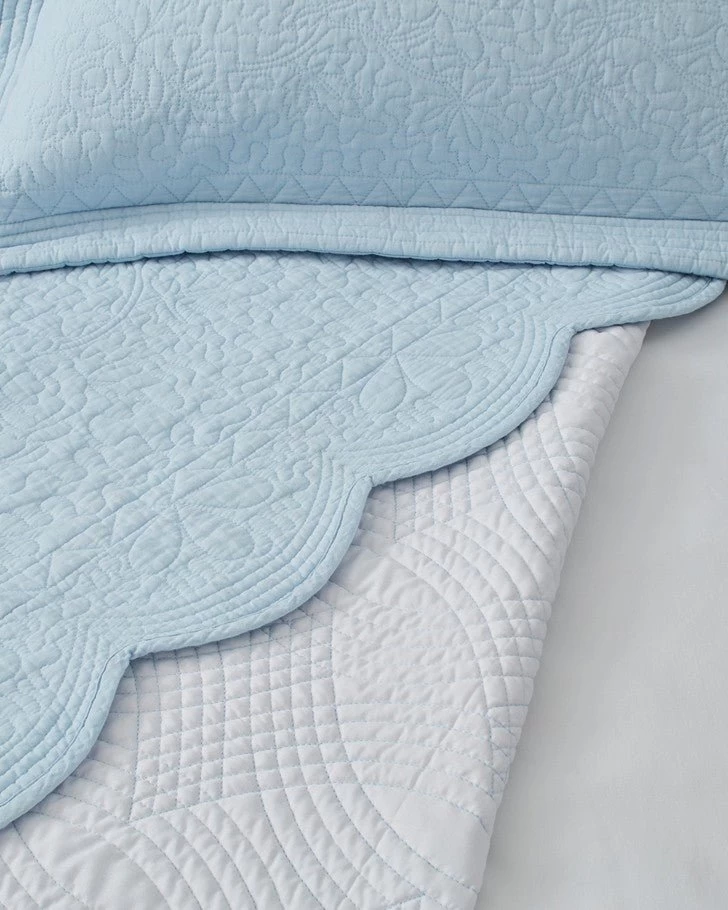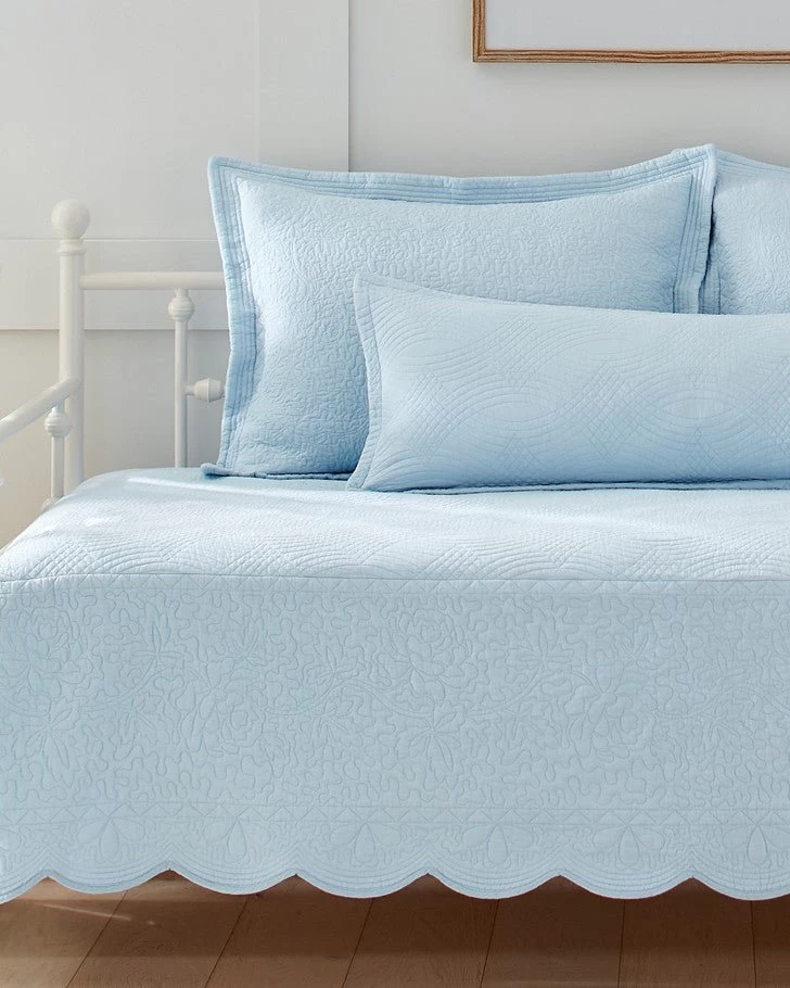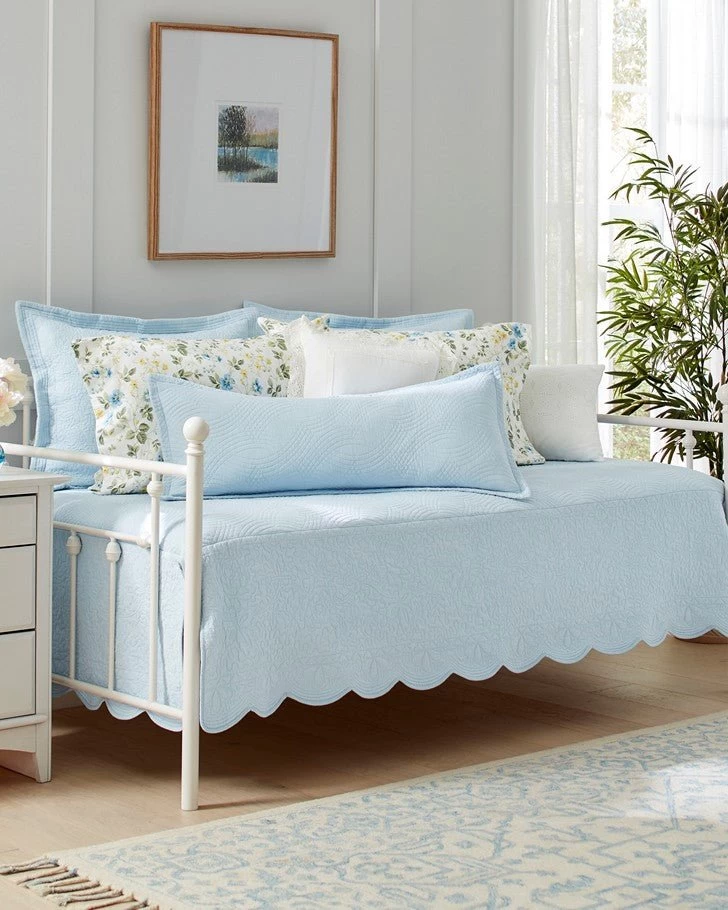 The Laura Ashley Trellis Daybed combines modern elegance with timeless style. A delicate trellis stitch covers the light blue daybed and shams. Coordinating 14×36″ bolster pillow cover can be used for a comfy backrest. This versatile daybed cover fits any décor and can be used in a bedroom, living room or home office. Made of 100% cotton with a cotton (80%) polyester (20%) filling and 100% polyester reverse, it is lightweight for year-round use. The set includes 1 quilt, 2 standard shams and 1 pillow cover. Machine washable, for easy care