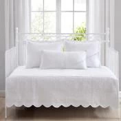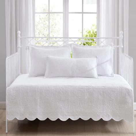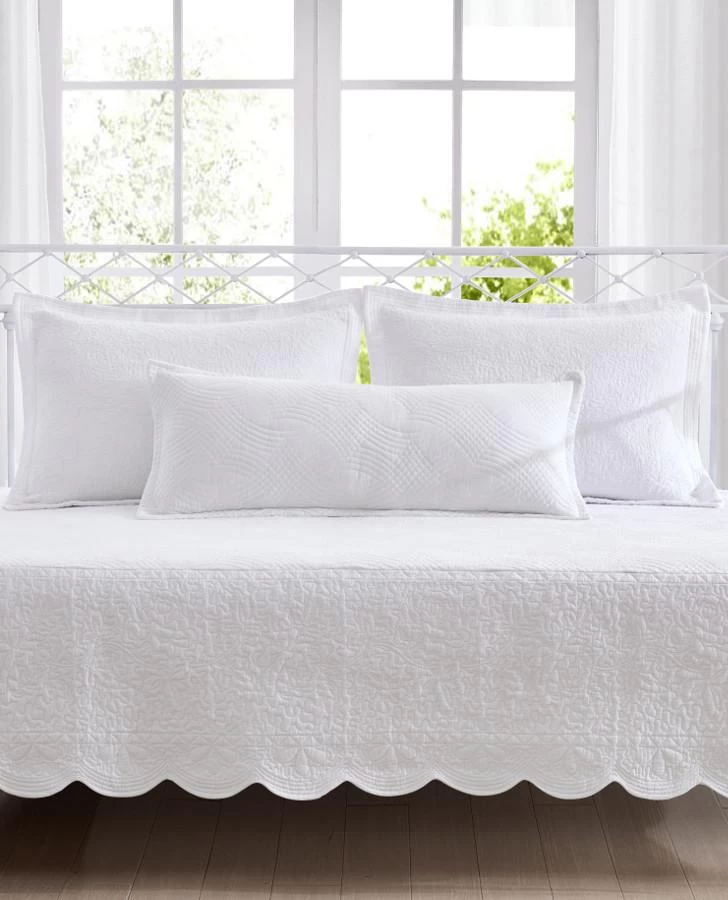 The Laura Ashley Solid Trellis daybed combines modern elegance with timeless style. A delicate trellis stitch covers the classic white daybed and shams. A coordinating 14×36 bolster pillow cover can be used for a comfy backrest. This versatile daybed cover fits any décor and can be used in a bedroom, living room or home office. Made of 100% cotton with a 100% polyester reverse, it is lightweight for year-round use.