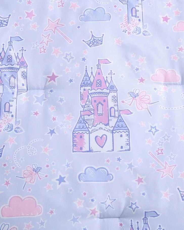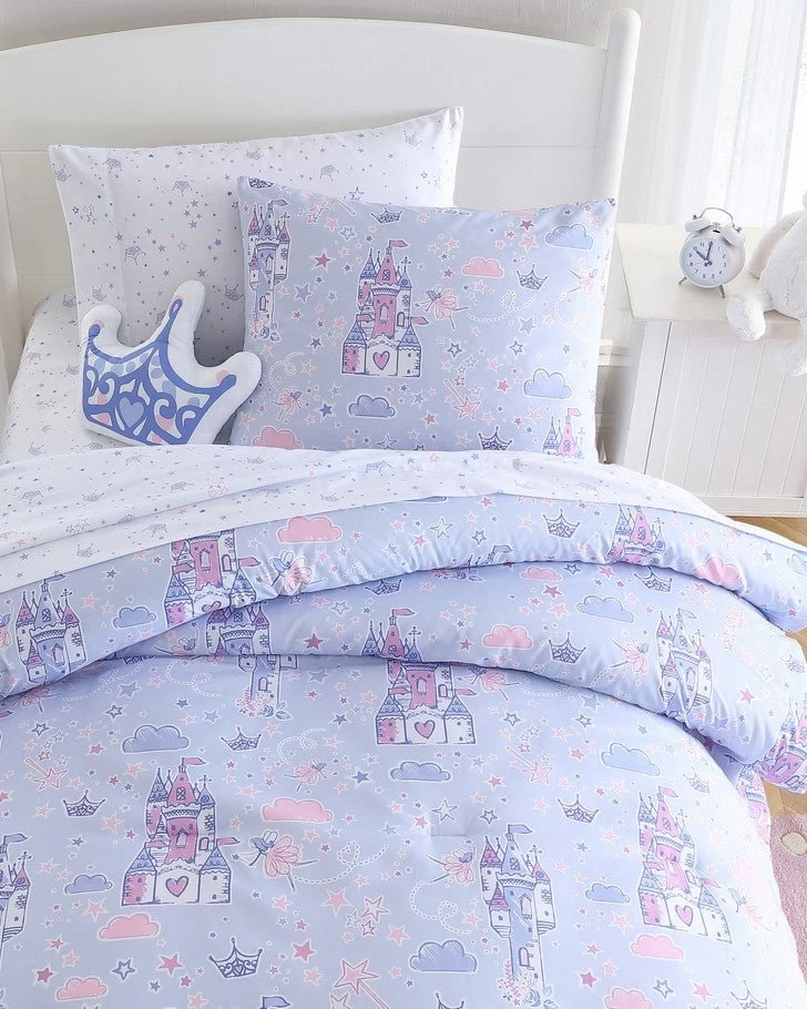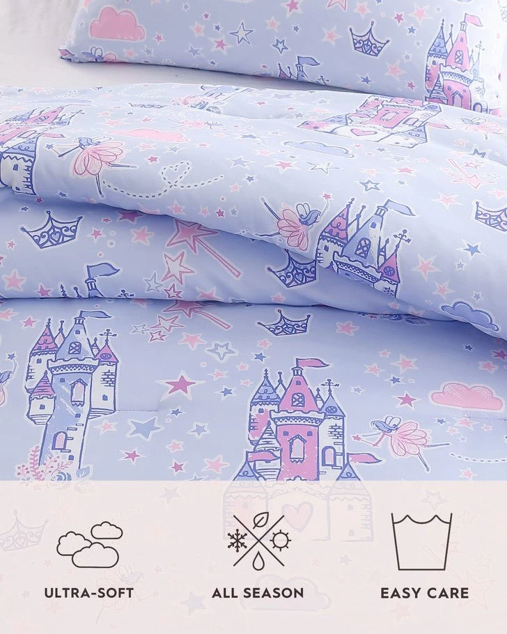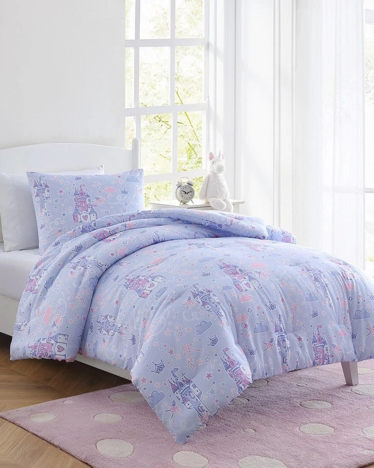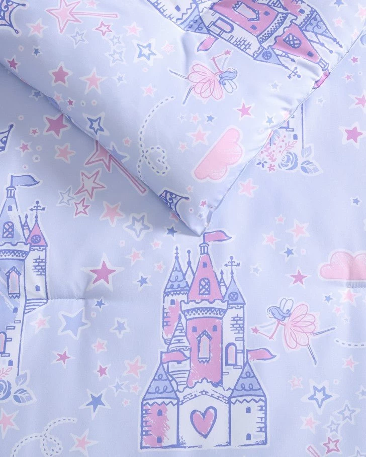 Introducing the enchanting Laura Ashley Kids comforter set, a dreamy addition to your child’s bedroom that combines comfort, style, and whimsical charm. Crafted with the utmost care, this set is designed to make bedtime a magical experience for your little one. This delightful comforter set boasts a captivating design featuring majestic castles, twinkling stars, and a charming fairies, all set against a soothing purple backdrop. This enchanting motif sparks the imagination and takes your child on a whimsical journey to a world of dreams and adventures every night. Set includes one comforter two shams (one in twin size) and a cute crown decorative pillow. The materials are 100% soft microfiber. CPSIA tested, ensuring it meets the highest safety standards for kids’ products. Additionally, it is Oeko-Tex Certified, guaranteeing that it is free from harmful substances, making it safe for your child’s delicate skin.