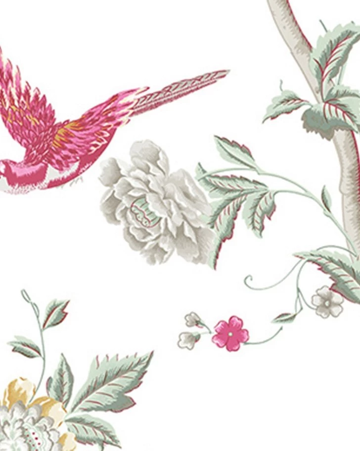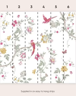 Add a pop of color to your walls with the Summer Palace wall mural. Elegant chinoiserie style birds and flowers are brought to life in this print. Striking shades of bright pink are enhanced on a light cream background. Laura Ashley murals come on one roll with 6 referenced panels.