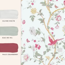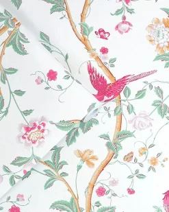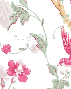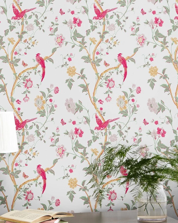 Add a pop of color to your walls with this Summer Palace wallpaper. Elegant chinoiserie style birds and flowers are brought to life in this print. Striking shades of bright pink are enhanced on a light cream background.