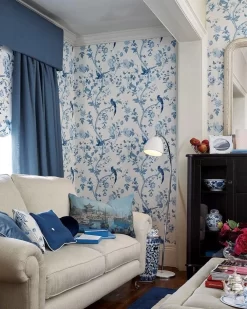 Add a pop of color to your walls with the Summer Palace wallpaper. Elegant chinoiserie style birds and flowers are brought to life in this print. Striking shades of royal blue are enhanced on a light cream background.